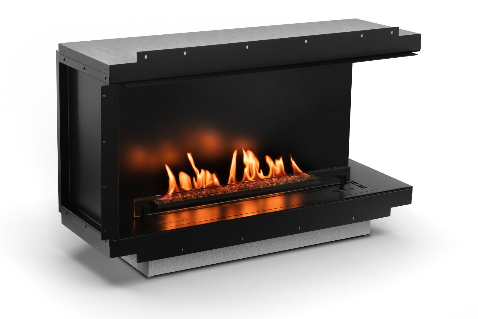 The Neo Fireplace is an entry-level automatic bioethanol fire in a zero-clearance casing featuring remote and phone App control, 2-level flame regulation and an electronic refill pump. Produces a soft flame which burns through a bed of small "coals". The casing can be reconfigured to create a left-cornered, right-cornered and three-sided casing as well as the original open-fronted casing.